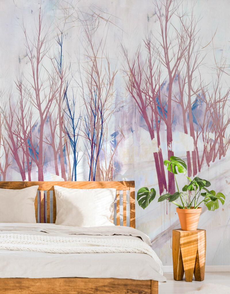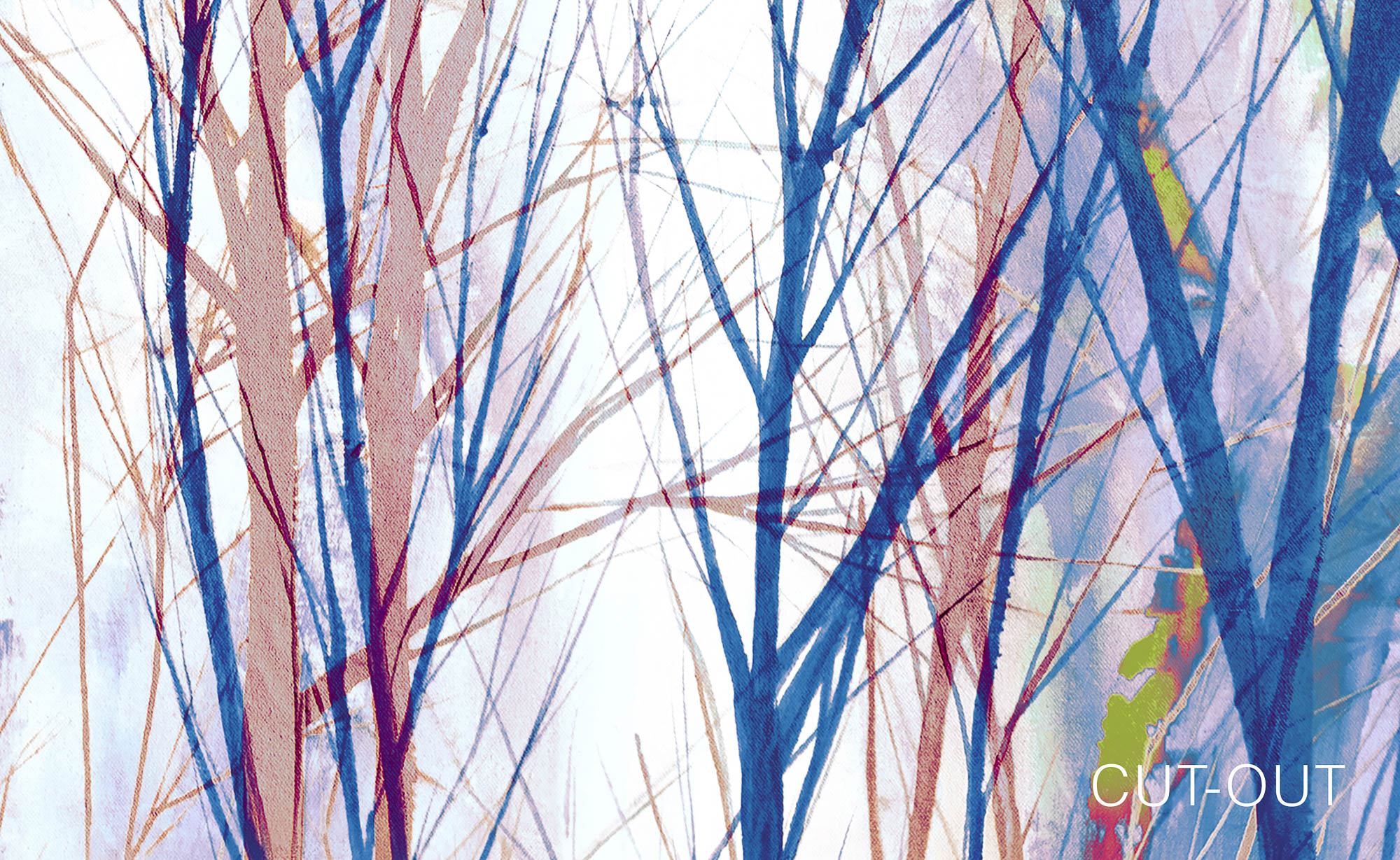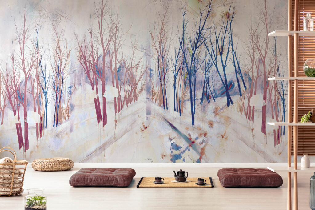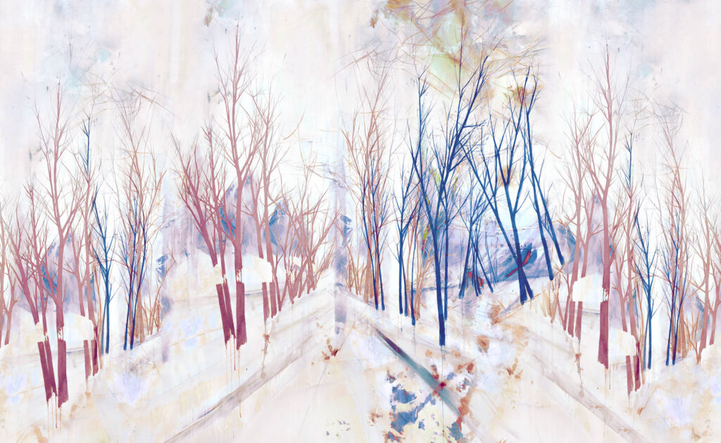Abstrahierte Baumreihen und feine Verästelungen verschmelzen zu einer ruhigen Komposition. Linien, Flächen und transparente Schichten schaffen Weite und Tiefe im Raum.