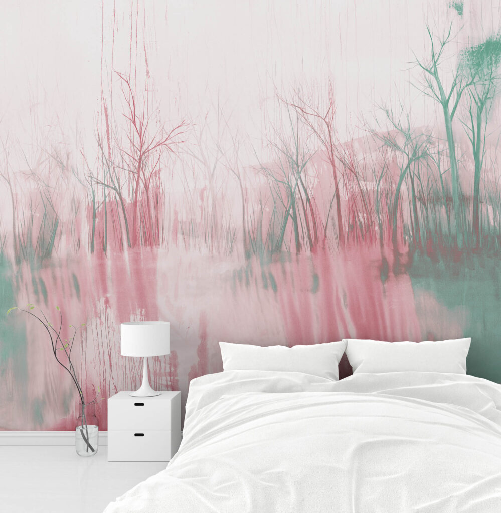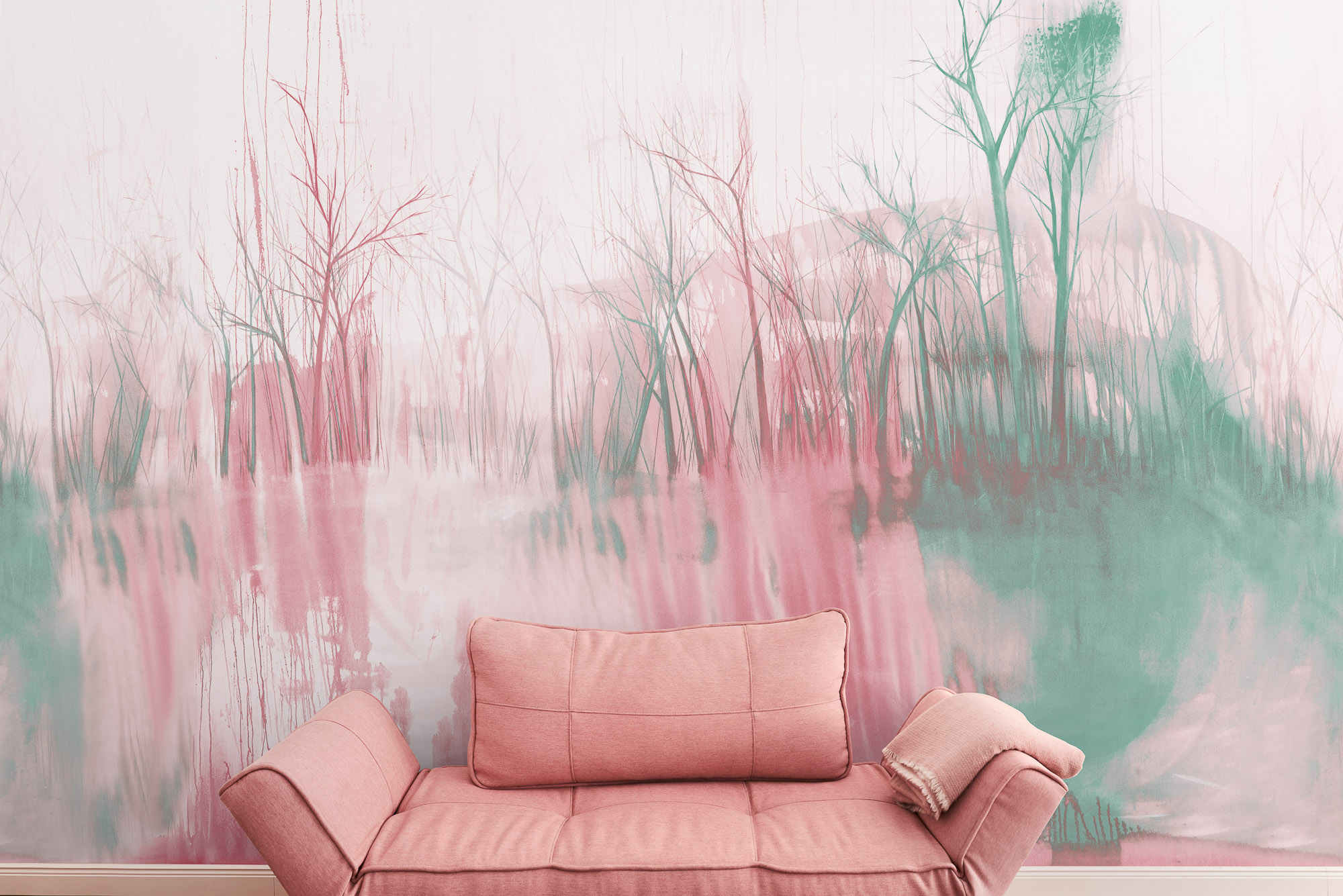 Jeder Entwurf basiert auf einem handgemalten Original. Die Motive zeigen abstrahierte Naturfragmente und schaffen eine stille, fließende Raumwirkung.