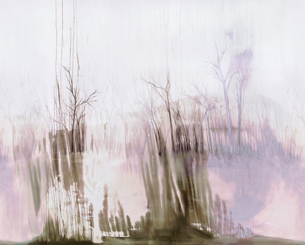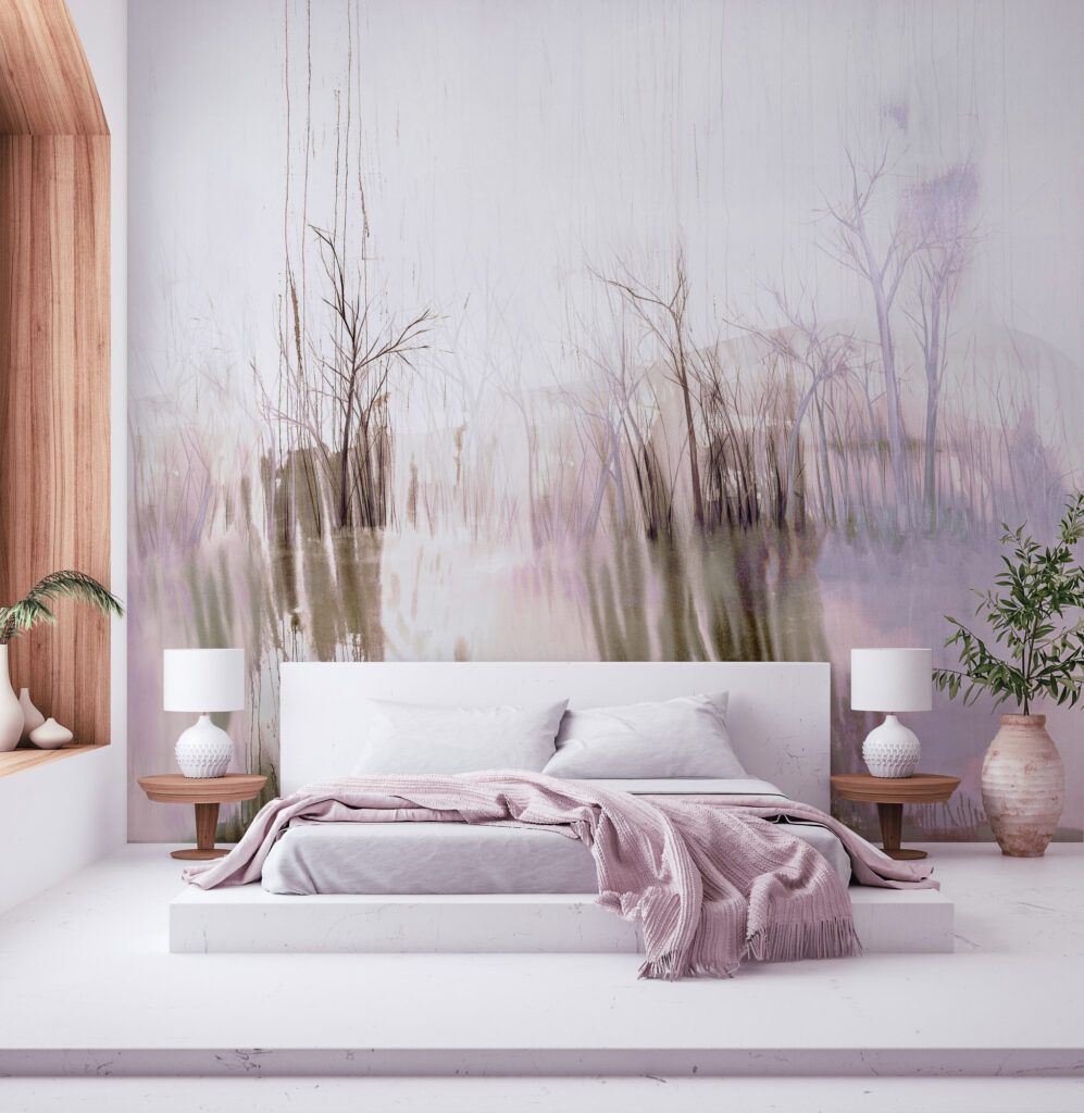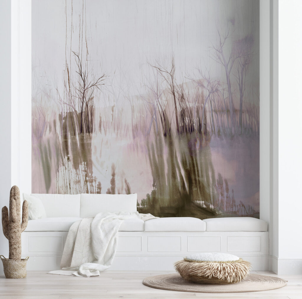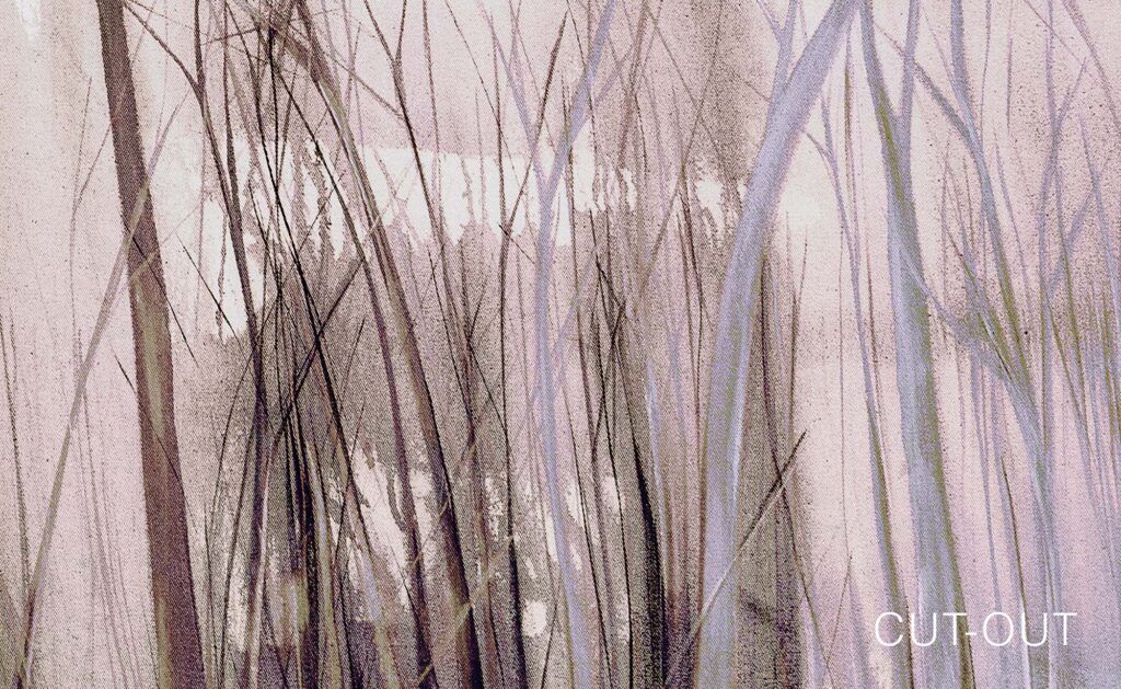 Jeder Entwurf basiert auf einem handgemalten Original. Die Motive zeigen abstrahierte Naturfragmente und schaffen eine stille, fließende Raumwirkung.