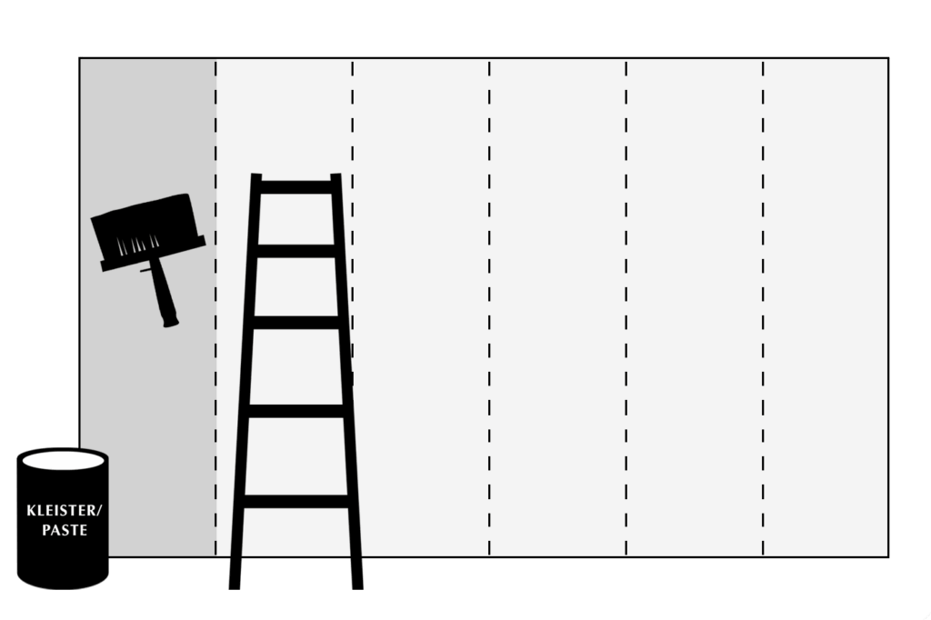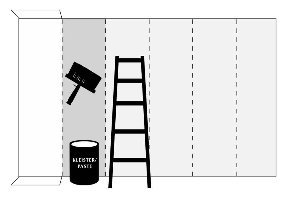 Kleister satt und gleichmäßig direkt auf die Wand auftragen – etwas über die erste Hilfslinie hinaus
